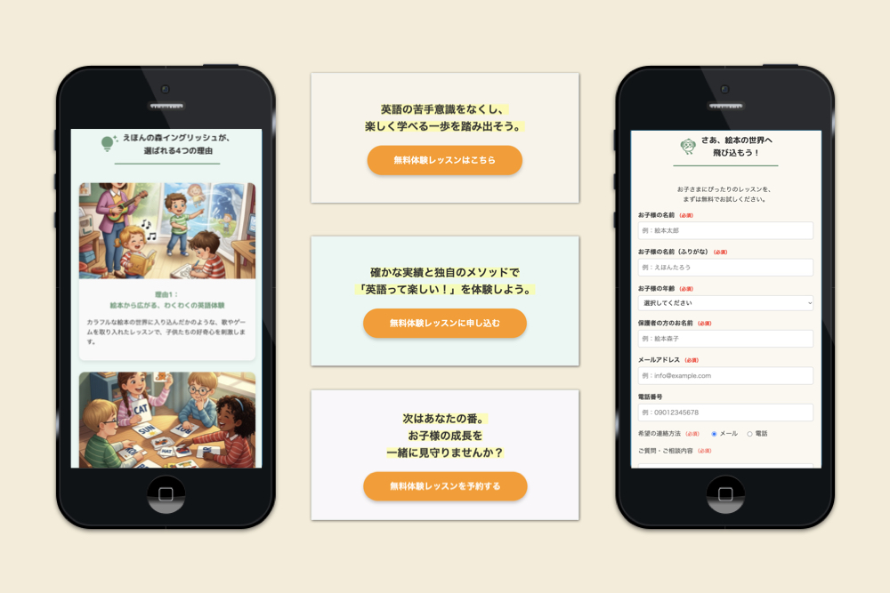 「英語を習わせたいけれど、勉強という形だと子供が飽きそう」「教室の雰囲気がわからないと不安」という保護者の方の悩みを解決する、架空の英語教室のLPを想定しました。