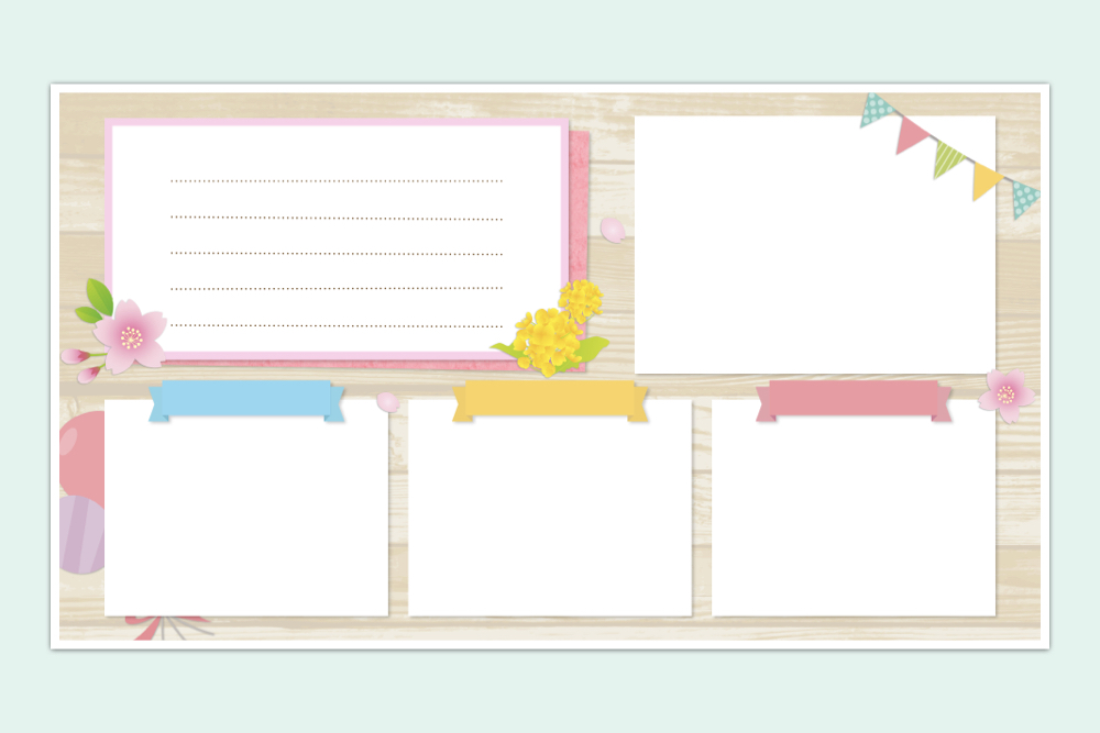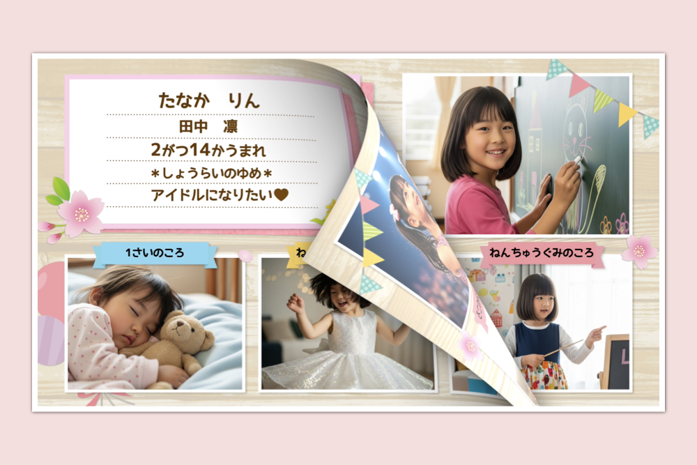 お子様の純粋な可愛らしさを表現するため、既成のテンプレートではなく、画用紙の質感やパステルカラー、手書き風のイラストを多用しました。(イラストはフリー素材を使用しています。)